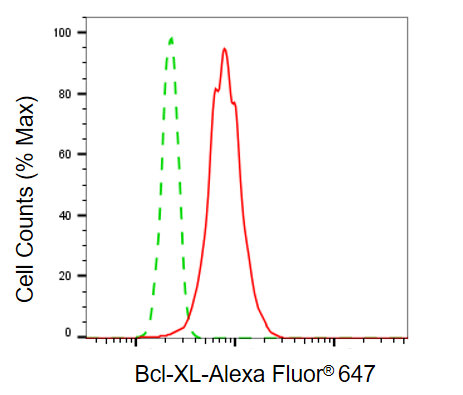 • Flow cytometric analysis of Bcl-XL expression in HT-1080 cells using Bcl-XL antibody. Green, isotype control; red, Bcl-XL.