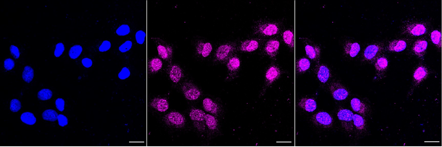 • Immunocytochemical staining of HT-1080 cells with Bcl-XL antibody. Nuclei were stained blue with DAPI; Bcl-XL was stained magenta with Alexa Fluor® 647. Images were taken using Leica stellaris 5. Protein abundance based on laser Intensity and smart gain: Low. Scale bar, 20 μm.