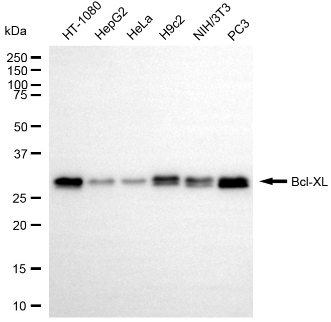 • Western blotting analysis using Bcl-XL antibody. Total cell lysates (30 μg) from various cell lines were loaded and separated by SDS-PAGE. The blot was incubated with Bcl-XL antibody and HRP-conjugated goat anti-rabbit secondary antibody respectively.