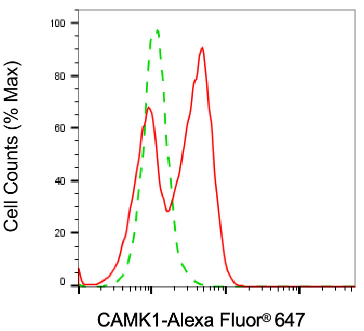 • Flow cytometric analysis of CAMK1 expression in HeLa cells using CAMK1 antibody. Green, isotype control; red, CAMK1.