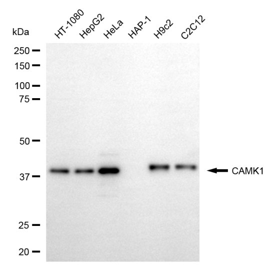 • Western blotting analysis using CAMK1 antibody. Total cell lysates (30 μg) from various cell lines were loaded and separated by SDS-PAGE. The blot was incubated with CAMK1 antibody and HRP-conjugated goat anti-rabbit secondary antibody respectively.
