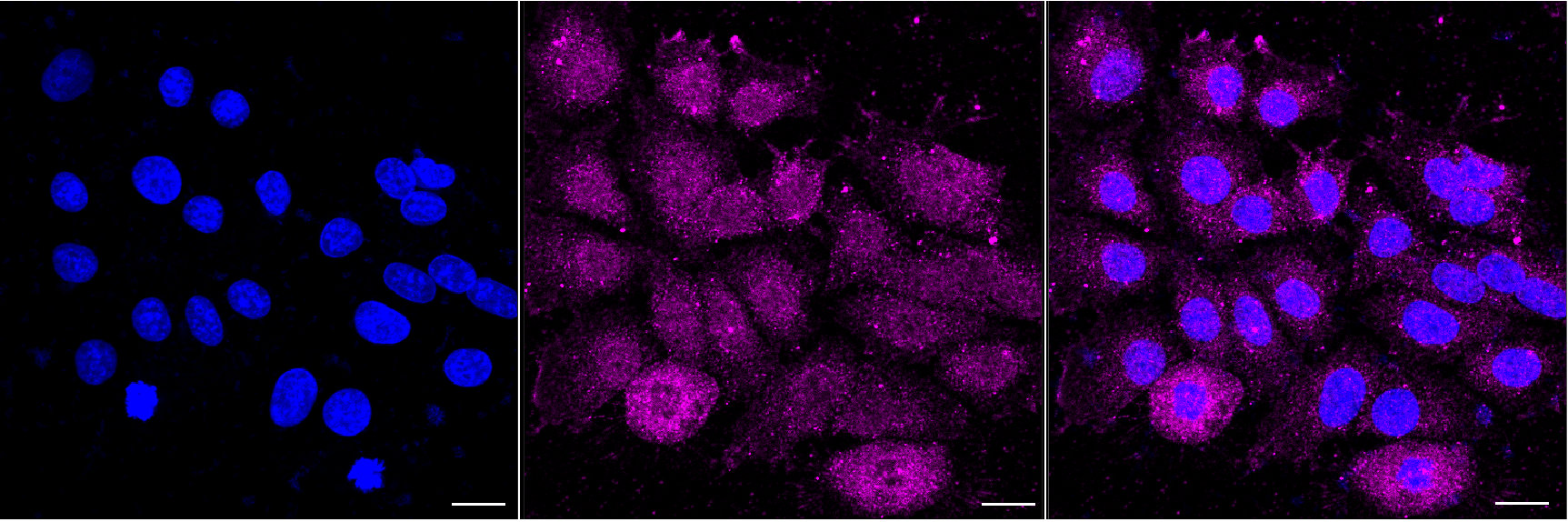• Immunocytochemical staining of HepG2 cells with Caspase 8 antibody. Nuclei were stained blue with DAPI; Caspase 8 was stained magenta with Alexa Fluor® 647. Images were taken using Leica stellaris 5. Protein abundance based on laser Intensity and smart gain: Medium. Scale bar, 20 μm.