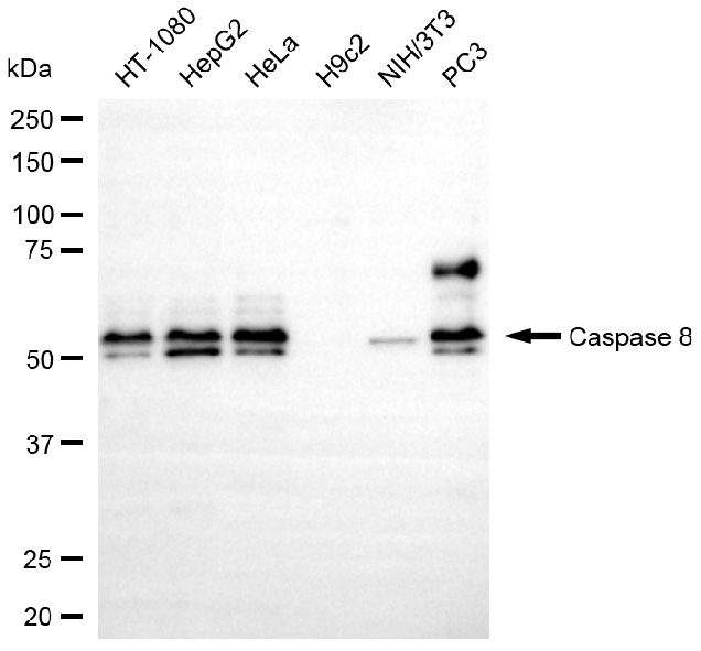 • Western blotting analysis using caspase 8 antibody. Total cell lysates (30 μg) from various cell lines were loaded and separated by SDS-PAGE. The blot was incubated with caspase 8 antibody and HRP-conjugated goat anti-rabbit secondary antibody respectively.