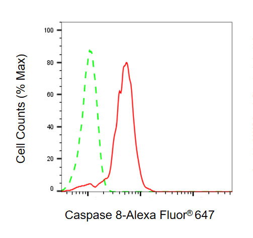• Flow cytometric analysis of Caspase 8 expression in HepG2 cells using Caspase 8 antibody. Green, isotype control; red, Caspase 8.
