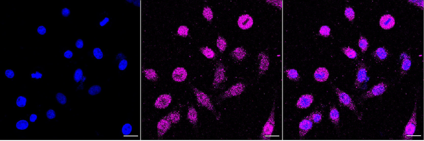 • Immunocytochemical staining of HepG2 cells with Caspase 8 antibody. Nuclei were stained blue with DAPI; Caspase 8 was stained magenta with Alexa Fluor® 647. Images were taken using Leica stellaris 5. Protein abundance based on laser Intensity and smart gain: Medium. Scale bar, 20 μm.