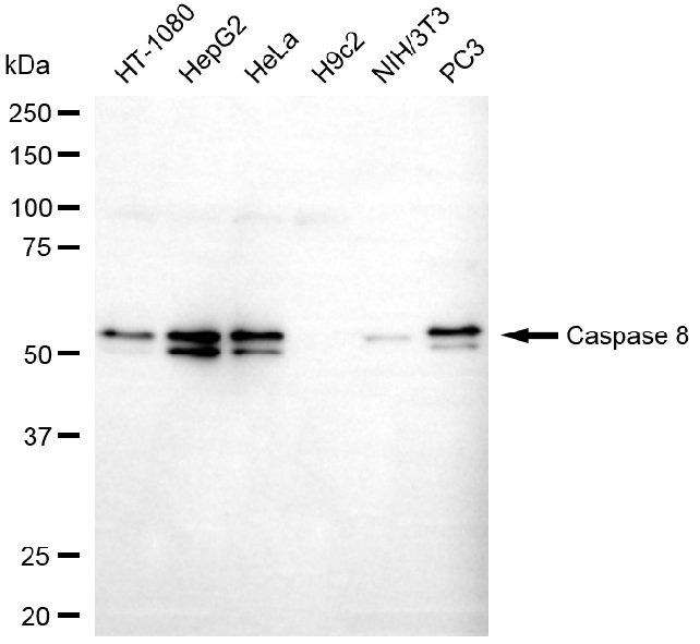 • Western blotting analysis using caspase 8 antibody. Total cell lysates (30 μg) from various cell lines were loaded and separated by SDS-PAGE. The blot was incubated with caspase 8 antibody and HRP-conjugated goat anti-rabbit secondary antibody respectively.