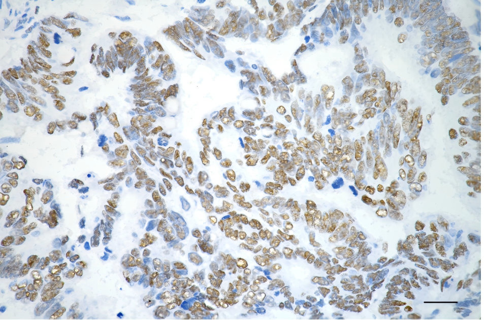 • Immunohistochemistry was performed on paraffin-embedded human sigmoid colon carcinoma using checkpoint kinase 2 antibody. Antigen retrieval was done in sodium citrate buffer (pH 6.0). DAB was used for detection, with hematoxylin counterstaining. Images were acquired using a Nikon Ci-L Plus microscope (40× objective). Scale bar: 25 μm.