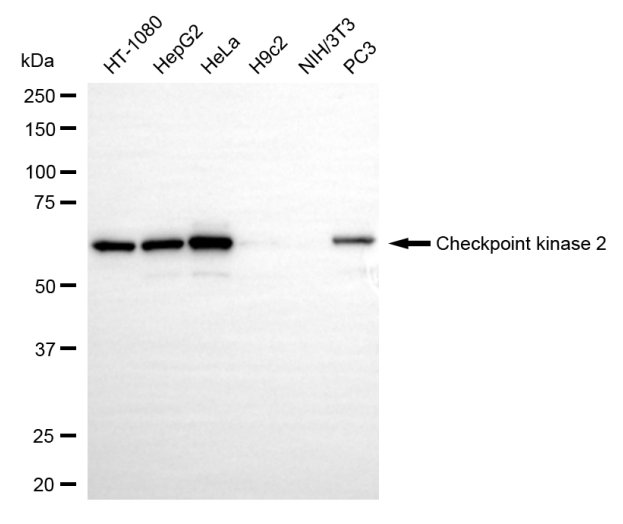 • Western blotting analysis using checkpoint kinase 2 antibody. Total cell lysates (30 μg) from various cell lines were loaded and separated by SDS-PAGE. The blot was incubated with checkpoint kinase 2 antibody and HRP-conjugated goat anti-rabbit secondary antibody respectively.