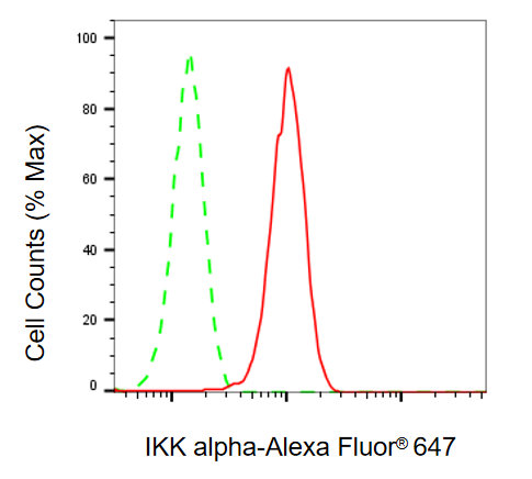 • Flow cytometric analysis of IKK alpha expression in HepG2 cells using IKK alpha antibody. Green, isotype control; red, IKK alpha.