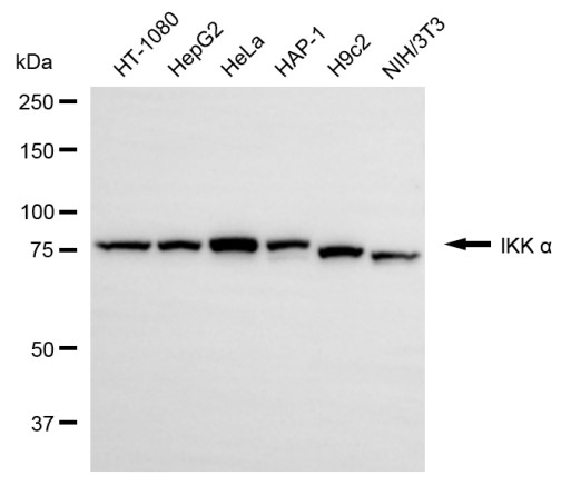 • Western blotting analysis using IKK α antibody. Total cell lysates (30 μg) from various cell lines were loaded and separated by SDS-PAGE. The blot was incubated with IKK α antibody and HRP-conjugated goat anti-rabbit secondary antibody respectively.