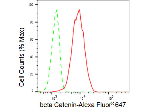 • Flow cytometric analysis of beta Catenin expression in C2C12 cells using beta Catenin antibody. Green, isotype control; red, beta Catenin.