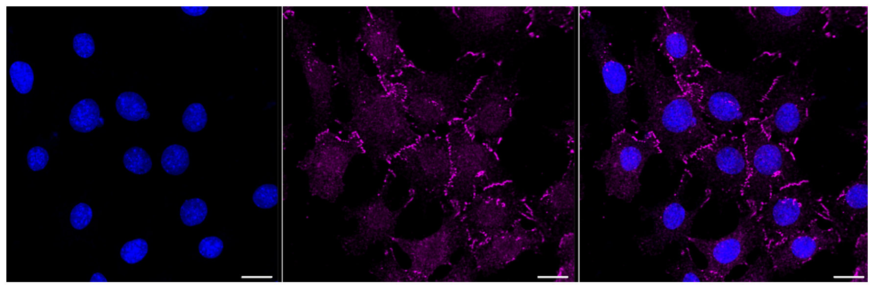 • Immunocytochemical staining of C2C12 cells with beta Catenin antibody. Nuclei were stained blue with DAPI; beta Catenin was stained magenta with Alexa Fluor® 647. Images were taken using Leica stellaris 5. Protein abundance based on laser Intensity and smart gain: Medium. Scale bar: 20 μm.
