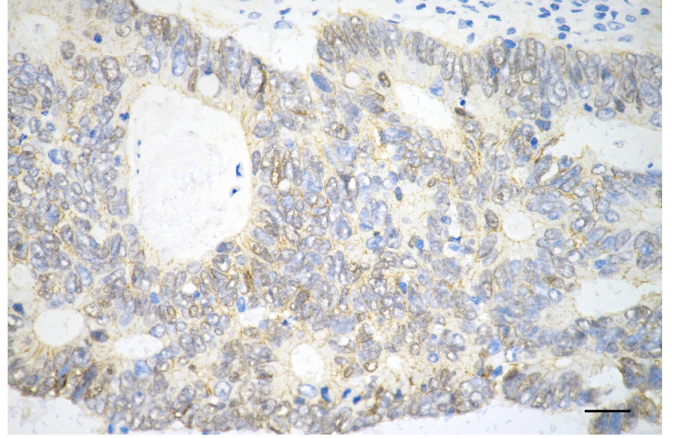 • Immunohistochemistry was performed on paraffin-embedded human sigmoid colon carcinoma using beta catenin antibody. Antigen retrieval was done in sodium citrate buffer (pH 6.0). DAB was used for detection, with hematoxylin counterstaining. Images were acquired using a Nikon Ci-L Plus microscope (40× objective). Scale bar: 25 μm.