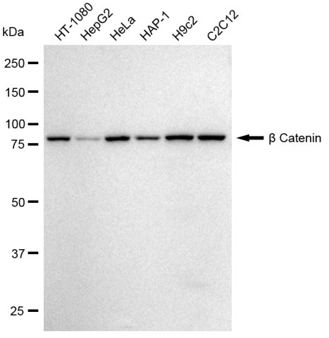 • Western blotting analysis using beta Catenin antibody. Total cell lysates (30 μg) from various cell lines were loaded and separated by SDS-PAGE. The blot was incubated with beta Cateninantibody and HRP-conjugated goat anti rabbit secondary antibody respectively.