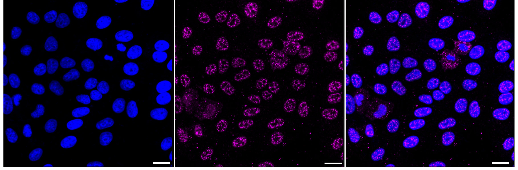 • Immunocytochemical staining of HepG2 cells with Phospho-EGFR (Y1068) antibody. Nuclei were stained blue with DAPI; Phospho-EGFR (Y1068) was stained magenta with Alexa Fluor® 647. Images were taken using Leica stellaris 5. Protein abundance based on laser Intensity and smart gain: Medium. Scale bar: 20 μm.