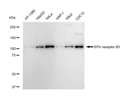Receptor tyrosine kinase which binds promiscuously transmembrane ephrin-B family ligands residing on adjacent cells, leading to contact-dependent bidirectional signaling into neighboring cells. The signaling pathway downstream of the receptor is referred to as forward signaling while the signaling pathway downstream of the ephrin ligand is referred to as reverse signaling. Generally has an overlapping and redundant function with EPHB2. Like EPHB2, functions in axon guidance during development regulating for instance the neurons forming the corpus callosum and the anterior commissure, 2 major interhemispheric connections between the temporal lobes of the cerebral cortex. In addition to its role in axon guidance plays also an important redundant role with other ephrin-B receptors in development and maturation of dendritic spines and the formation of excitatory synapses. Controls other aspects of development through regulation of cell migration and positioning. This includes angiogenesis, palate development and thymic epithelium development for instance. Forward and reverse signaling through the EFNB2/EPHB3 complex also regulate migration and adhesion of cells that tubularize the urethra and septate the cloaca. Finally, plays an important role in intestinal epithelium differentiation segregating progenitor from differentiated cells in the crypt.