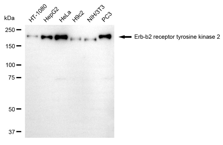 Protein tyrosine kinase that is part of several cell surface receptor complexes, but that apparently needs a coreceptor for ligand binding. Essential component of a neuregulin-receptor complex, although neuregulins do not interact with it alone. GP30 is a potential ligand for this receptor. Regulates outgrowth and stabilization of peripheral microtubules (MTs). Upon ERBB2 activation, the MEMO1-RHOA-DIAPH1 signaling pathway elicits the phosphorylation and thus the inhibition of GSK3B at cell membrane. This prevents the phosphorylation of APC and CLASP2, allowing its association with the cell membrane. In turn, membrane-bound APC allows the localization of MACF1 to the cell membrane, which is required for microtubule capture and stabilization.; In the nucleus is involved in transcriptional regulation. Associates with the 5'-TCAAATTC-3' sequence in the PTGS2/COX-2 promoter and activates its transcription. Implicated in transcriptional activation of CDKN1A; the function involves STAT3 and SRC. Involved in the transcription of rRNA genes by RNA Pol I and enhances protein synthesis and cell growth.