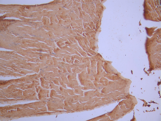 • IHC image of CSB-RA008424MA2HU diluted at 1:50 and staining in paraffin-embedded human skeletal muscle tissue performed on a Leica BondTM system. After dewaxing and hydration, antigen retrieval was mediated by high pressure in a citrate buffer (pH 6.0). Section was blocked with 10% normal goat serum 30min at RT. Then primary antibody (1% BSA) was incubated at 4°C overnight. The primary is detected by a Anti-Human lgG, Fcy Fragment Specific labeled by HRP and visualized using 0.05% DAB.