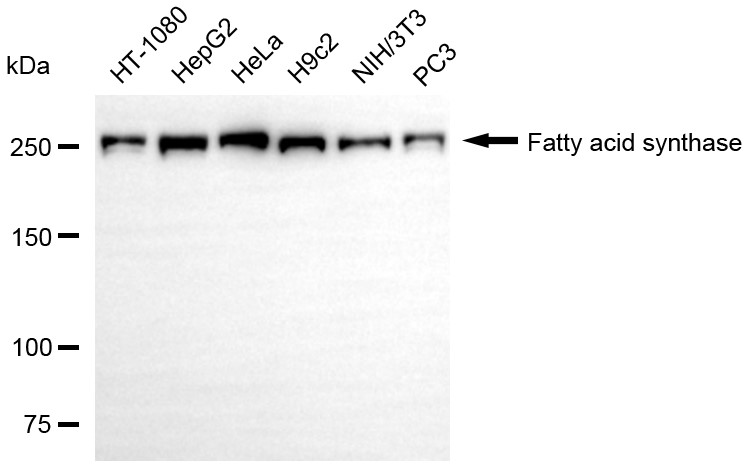 FASN; Fatty Acid Synthase; FAS; SDR27X1; Short Chain Dehydrogenase/Reductase Family 27X, Member 1; 3-Hydroxyacyl-[Acyl-Carrier-Protein] Dehydratase; [Acyl-Carrier-Protein] S-Malonyltransferase; [Acyl-Carrier-Protein] S-Acetyltransferase; 3-Oxoacyl-[Acyl-Carrier-Protein] Reductase; 3-Oxoacyl-[Acyl-Carrier-Protein] Synthase; Enoyl-[Acyl-Carrier-Protein] Reductase; Acyl-[Acyl-Carrier-Protein] Hydrolase; Type I Fatty Acid Synthase; EC 2.3.1.85; EC 6.3.3.1; EC 2.3.1; OA-519