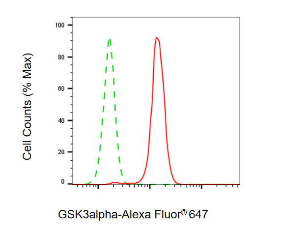 • Flow cytometric analysis of GSK3 alpha expression in HepG2 cells using GSK3 alpha antibody. Green, isotype control; red, GSK3 alpha.