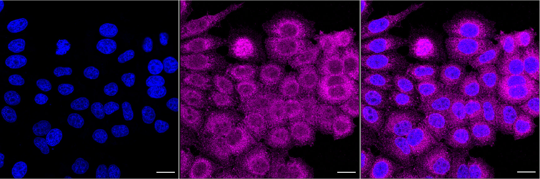 • Immunocytochemical staining of HepG2 cells with GSK3 alpha antibody. Nuclei were stained blue with DAPI; GSK3 alpha was stained magenta with Alexa Fluor® 647. Images were taken using Leica stellaris 5. Protein abundance based on laser Intensity and smart gain: Medium. Scale bar, 20 μm.
