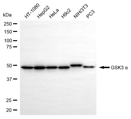 • Western blotting analysis using GSK3 alpha antibody. Total cell lysates (30 μg) from various cell lines were loaded and separated by SDS-PAGE. The blot was incubated with GSK3 alpha antibody and HRP-conjugated goat anti-rabbit secondary antibody respectively.