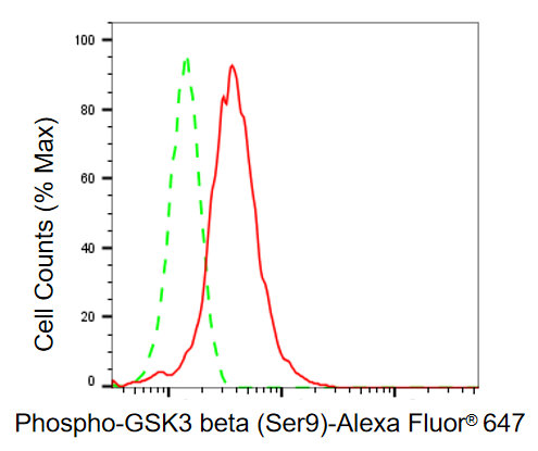 • Flow cytometric analysis of phospho-GSK3 beta (Ser9) expression in HepG2 cells using phospho-GSK3 beta (Ser9) antibody. Green, isotype control; red, phospho-GSK3 beta (Ser9).