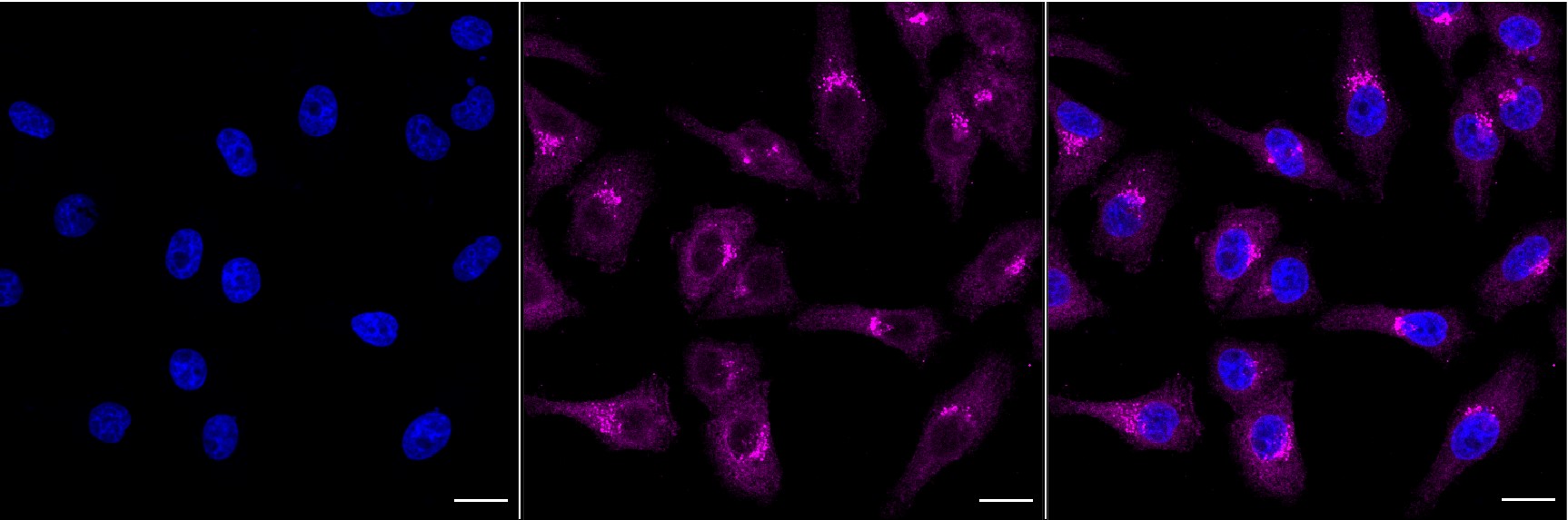 • Immunocytochemical staining of HepG2 cells with Phospho-GSK3 beta (Ser9) antibody. Nuclei were stained blue with DAPI; Phospho-GSK3 beta (Ser9) was stained magenta with Alexa Fluor® 647. Images were taken using Leica stellaris 5. Protein abundance based on laser Intensity and smart gain: High. Scale bar, 20 μm.