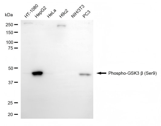 • Western blotting analysis using phospho-GSK3 beta (Ser9) antibody. Total cell lysates (30 μg) from various cell lines were loaded and separated by SDS-PAGE. The blot was incubated with phospho-GSK3 beta (Ser9) antibody and HRP-conjugated goat anti-rabbit secondary antibody respectively.