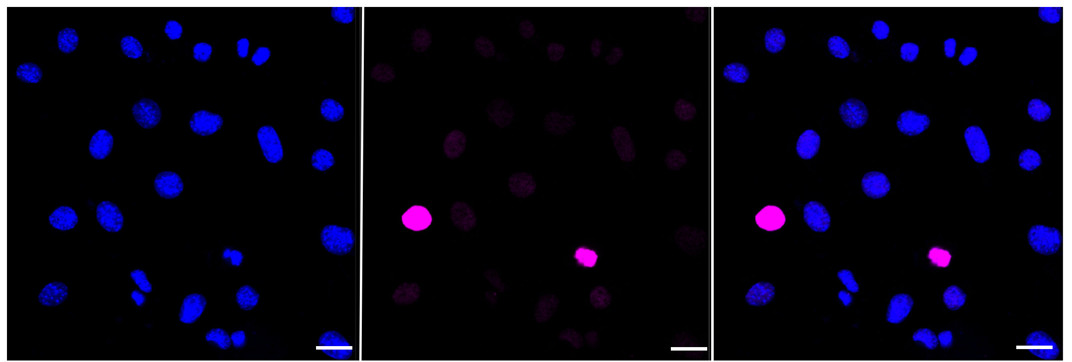 • Immunocytochemical staining of C2C12 cells with Phospho-Histone H3 (T3) antibody. Nuclei were stained blue with DAPI; Phospho-Histone H3 (T3) was stained magenta with Alexa Fluor® 647. Images were taken using Leica stellaris 5. Protein abundance based on laser Intensity and smart gain: High. Scale bar: 20 μm.
