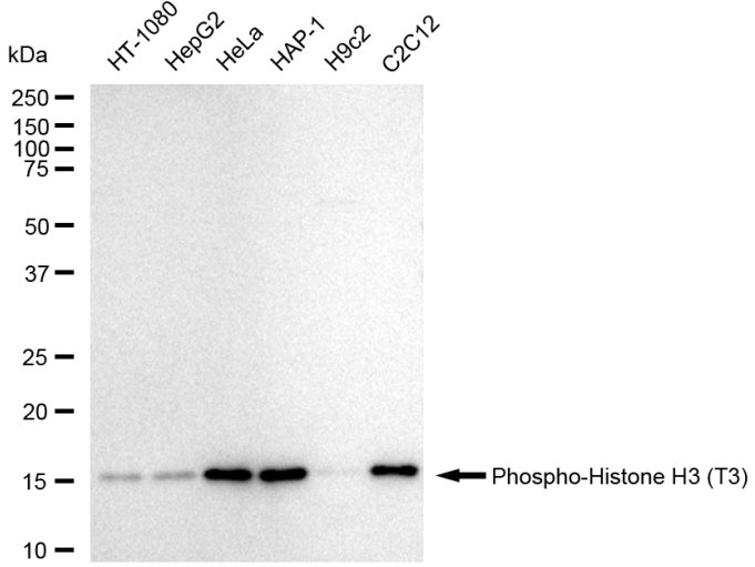 • Western blotting analysis using Phospho-Histone H3 (T3) antibody. Total cell lysates (5 μg) from various cell lines were loaded and separated by SDS-PAGE. The blot was incubated with Phospho-Histone H3 (T3) antibody and HRP-conjugated goat anti-rabbit secondary antibody respectively.