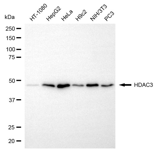Responsible for the deacetylation of lysine residues on the N-terminal part of the core histones (H2A, H2B, H3 and H4), and some other non-histone substrates. Histone deacetylation gives a tag for epigenetic repression and plays an important role in transcriptional regulation, cell cycle progression and developmental events. Histone deacetylases act via the formation of large multiprotein complexes. Participates in the BCL6 transcriptional repressor activity by deacetylating the H3 'Lys-27' (H3K27) on enhancer elements, antagonizing EP300 acetyltransferase activity and repressing proximal gene expression. Probably participates in the regulation of transcription through its binding to the zinc-finger transcription factor YY1; increases YY1 repression activity. Required to repress transcription of the POU1F1 transcription factor. Acts as a molecular chaperone for shuttling phosphorylated NR2C1 to PML bodies for sumoylation. Contributes, together with XBP1 isoform 1, to the activation of NFE2L2-mediated HMOX1 transcription factor gene expression in a PI(3)K/mTORC2/Akt-dependent signaling pathway leading to endothelial cell (EC) survival under disturbed flow/oxidative stress. Regulates both the transcriptional activation and repression phases of the circadian clock in a deacetylase activity-independent manner. During the activation phase, promotes the accumulation of ubiquitinated ARNTL/BMAL1 at the E-boxes and during the repression phase, blocks FBXL3-mediated CRY1/2 ubiquitination and promotes the interaction of CRY1 and ARNTL/BMAL1. The NCOR1-HDAC3 complex regulates the circadian expression of the core clock gene ARTNL/BMAL1 and the genes involved in lipid metabolism in the liver. Serves as a corepressor of RARA, causing its deacetylation and inhibition of RARE DNA element binding. In association with RARA, plays a role in the repression of microRNA-10a and thereby in the inflammatory response. Interacts with SETD5.