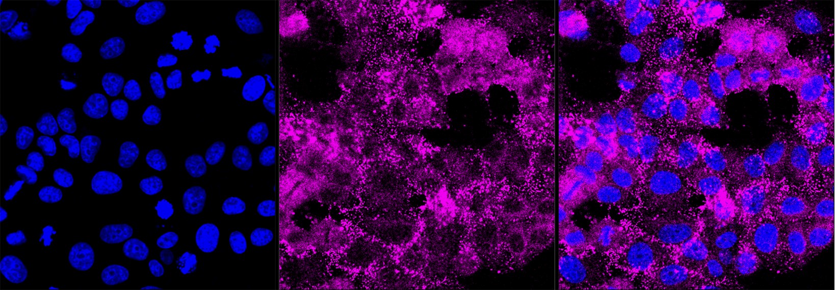 • Immunocytochemical staining of HepG2 cells with Histone deacetylase 6 antibody. Nuclei were stained blue with DAPI; Histone deacetylase 6 was stained magenta with Alexa Fluor® 647. Images were taken using Leica stellaris 5. Protein abundance based on laser Intensity and smart gain: Medium. Scale bar, 20 μm.