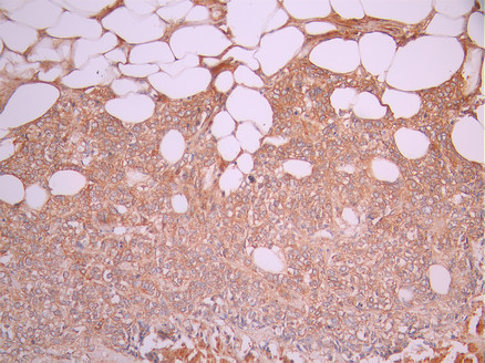 • IHC image of CSB-RA270243A0HU diluted at 1:100 and staining in paraffin-embedded human breast cancer performed on a Leica BondTM system. After dewaxing and hydration, antigen retrieval was mediated by high pressure in a citrate buffer (pH 6.0). Section was blocked with 10% normal goat serum 30min at RT. Then primary antibody (1% BSA) was incubated at 4°C overnight. The primary is detected by a Goat anti-rabbit polymer IgG labeled by HRP and visualized using 0.05% DAB.