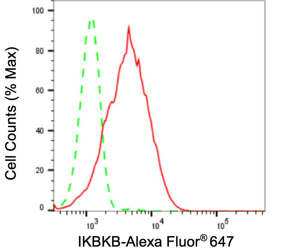 • Flow cytometric analysis of IKBKB expression in HepG2 cells using IKBKB antibody. Green, isotype control; red, IKBKB.