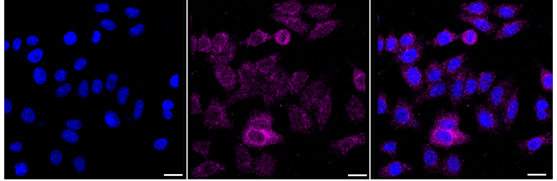 • Immunocytochemical staining of HepG2 cells with IKBKB antibody. Nuclei were stained blue with DAPI; IKBKB was stained magenta with Alexa Fluor® 647. Images were taken using Leica stellaris 5. Protein abundance based on laser Intensity and smart gain: Medium. Scale bar: 20 μm.
