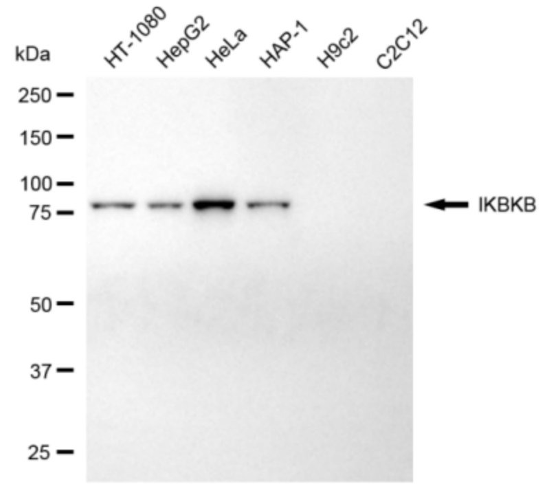 • Western blotting analysis using IKBKB antibody. Total cell lysates (30 μg) from various cell lines were loaded and separated by SDS-PAGE. The blot was incubated with IKBKB antibody and HRP-conjugated goat anti-rabbit secondary antibody respectively. Image was developed using FeQ™ ECL Substrate Kit