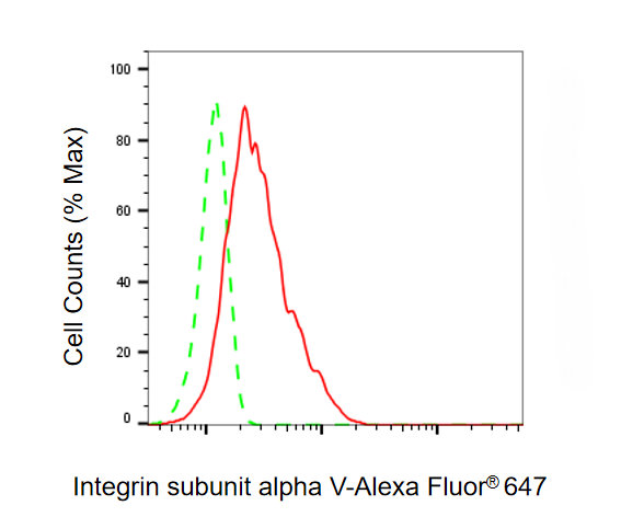 • Flow cytometric analysis of Integrin subunit alpha V expression in HepG2 cells using Integrin subunit alpha V antibody. Green, isotype control; red, Integrin subunit alpha V.