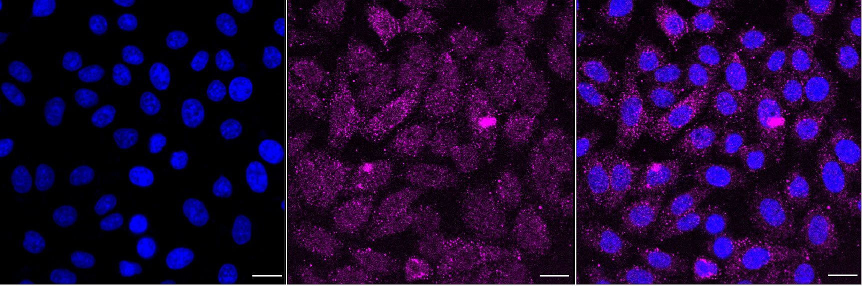 • Immunocytochemical staining of HepG2 cells with Integrin subunit alpha V antibody. Nuclei were stained blue with DAPI; Integrin subunit alpha V was stained magenta with Alexa Fluor® 647. Images were taken using Leica stellaris 5. Protein abundance based on laser Intensity and smart gain: Low. Scale bar, 20 μm.
