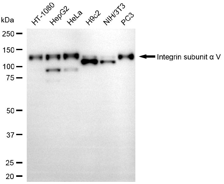• Western blotting analysis using integrin subunit alpha V antibody. Total cell lysates (30 μg) from various cell lines were loaded and separated by SDS-PAGE. The blot was incubated with integrin subunit alpha V antibody and HRP-conjugated goat anti-rabbit secondary antibody respectively.
