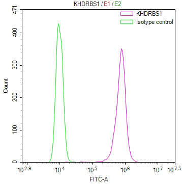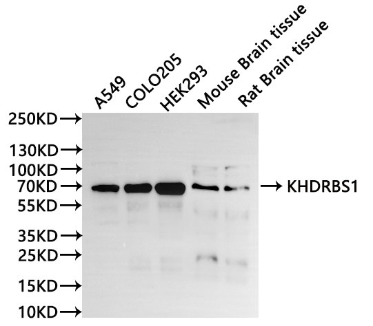 Recruited and tyrosine phosphorylated by several receptor systems, for example the T-cell, leptin and insulin receptors. Once phosphorylated, functions as an adapter protein in signal transduction cascades by binding to SH2 and SH3 domain-containing proteins. Role in G2-M progression in the cell cycle. Represses CBP-dependent transcriptional activation apparently by competing with other nuclear factors for binding to CBP. Also acts as a putative regulator of mRNA stability and/or translation rates and mediates mRNA nuclear export. Positively regulates the association of constitutive transport element (CTE)-containing mRNA with large polyribosomes and translation initiation. According to some authors, is not involved in the nucleocytoplasmic export of unspliced (CTE)-containing RNA species according to. RNA-binding protein that plays a role in the regulation of alternative splicing and influences mRNA splice site selection and exon inclusion. Binds to RNA containing 5'-[AU]UAA-3' as a bipartite motif spaced by more than 15 nucleotides. Binds poly(A). Can regulate CD44 alternative splicing in a Ras pathway-dependent manner. In cooperation with HNRNPA1 modulates alternative splicing of BCL2L1 by promoting splicing toward isoform Bcl-X(S), and of SMN1. Can regulate alternative splicing of NRXN1 and NRXN3 in the laminin G-like domain 6 containing the evolutionary conserved neurexin alternative spliced segment 4 (AS4) involved in neurexin selective targeting to postsynaptic partners. In a neuronal activity-dependent manner cooperates synergistically with KHDRBS2/SLIM-1 in regulation of NRXN1 exon skipping at AS4. The cooperation with KHDRBS2/SLIM-1 is antagonistic for regulation of NXRN3 alternative splicing at AS4.; Isoform 3, which is expressed in growth-arrested cells only, inhibits S phase.