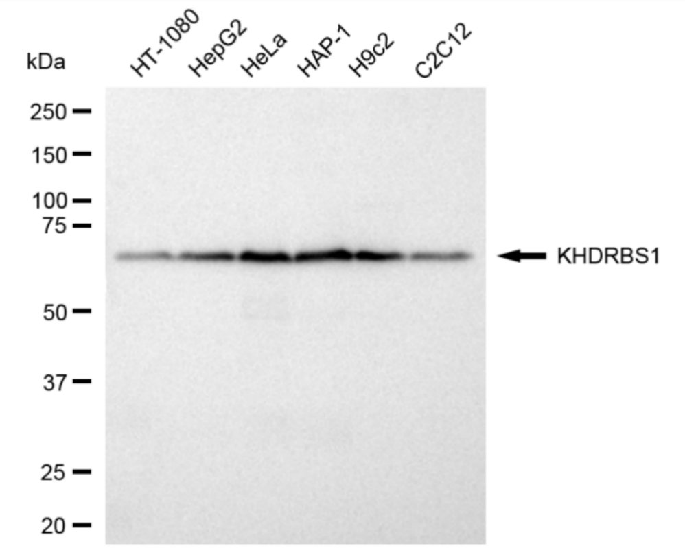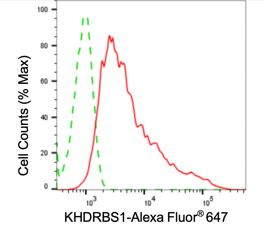 Recruited and tyrosine phosphorylated by several receptor systems, for example the T-cell, leptin and insulin receptors. Once phosphorylated, functions as an adapter protein in signal transduction cascades by binding to SH2 and SH3 domain-containing proteins. Role in G2-M progression in the cell cycle. Represses CBP-dependent transcriptional activation apparently by competing with other nuclear factors for binding to CBP. Also acts as a putative regulator of mRNA stability and/or translation rates and mediates mRNA nuclear export. Positively regulates the association of constitutive transport element (CTE)-containing mRNA with large polyribosomes and translation initiation. According to some authors, is not involved in the nucleocytoplasmic export of unspliced (CTE)-containing RNA species according to. RNA-binding protein that plays a role in the regulation of alternative splicing and influences mRNA splice site selection and exon inclusion. Binds to RNA containing 5'-[AU]UAA-3' as a bipartite motif spaced by more than 15 nucleotides. Binds poly(A). Can regulate CD44 alternative splicing in a Ras pathway-dependent manner. In cooperation with HNRNPA1 modulates alternative splicing of BCL2L1 by promoting splicing toward isoform Bcl-X(S), and of SMN1. Can regulate alternative splicing of NRXN1 and NRXN3 in the laminin G-like domain 6 containing the evolutionary conserved neurexin alternative spliced segment 4 (AS4) involved in neurexin selective targeting to postsynaptic partners. In a neuronal activity-dependent manner cooperates synergistically with KHDRBS2/SLIM-1 in regulation of NRXN1 exon skipping at AS4. The cooperation with KHDRBS2/SLIM-1 is antagonistic for regulation of NXRN3 alternative splicing at AS4.; Isoform 3, which is expressed in growth-arrested cells only, inhibits S phase.