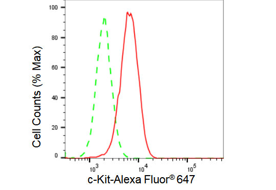 • Flow cytometric analysis of c-Kit expression in HAP-1 cells using c-Kit antibody. Green, isotype control; red, c-Kit.