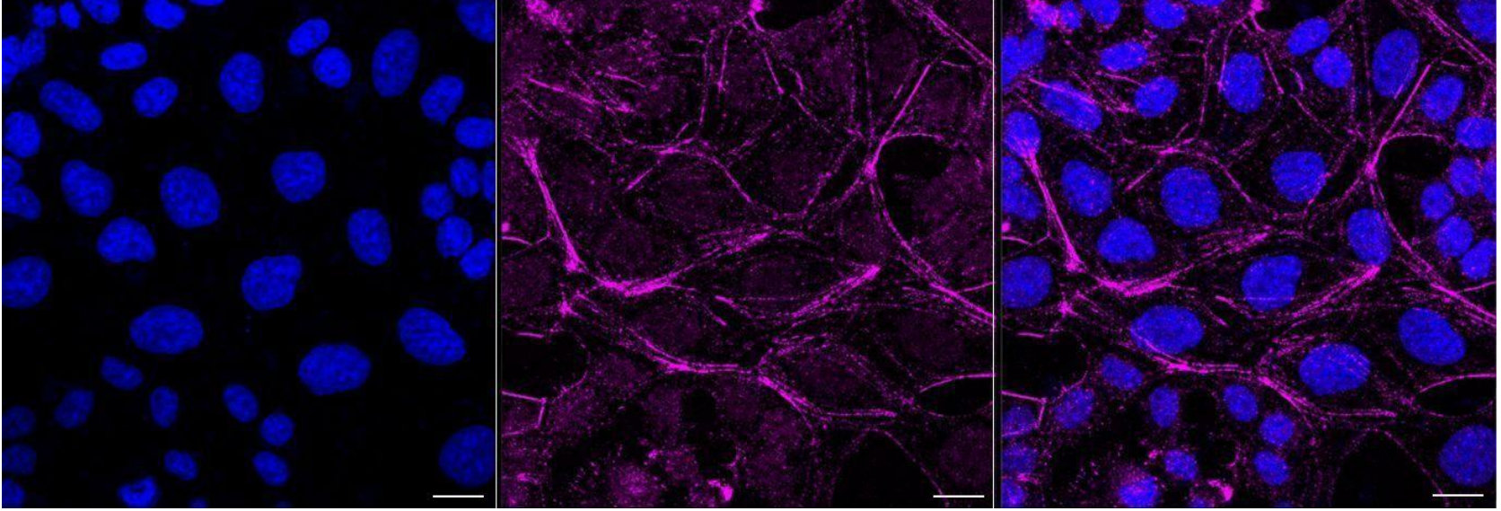 • Immunocytochemical staining of HAP-1 cells with c-Kit antibody. Nuclei were stained blue with DAPI; c-Kit was stained magenta with Alexa Fluor® 647. Images were taken using Leica stellaris 5. Protein abundance based on laser Intensity and smart gain: Medium. Scale bar, 20 μm.