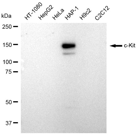 • Western blotting analysis using c-Kit antibody. Total cell lysates (30 μg) from various cell lines were loaded and separated by SDS-PAGE. The blot was incubated with c-Kit antibody and HRP-conjugated goat anti-rabbit secondary antibody respectively.