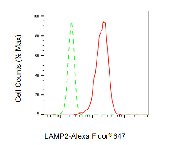 • Flow cytometric analysis of LAMP2 expression in HeLa cells using LAMP2 antibody. Green, isotype control; red, LAMP2.