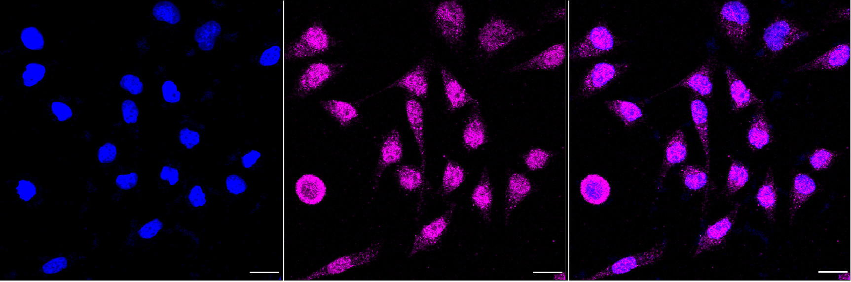 • Immunocytochemical staining of Hela cells with LAMP2 antibody. Nuclei were stained blue with DAPI; LAMP2 was stained magenta with Alexa Fluor® 647. Images were taken using Leica stellaris 5. Protein abundance based on laser Intensity and smart gain: Medium. Scale bar, 20 μm.