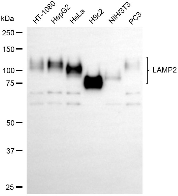 • Western blotting analysis using LAMP2 antibody. Total cell lysates (30 μg) from various cell lines were loaded and separated by SDS-PAGE. The blot was incubated with LAMP2 antibody and HRP-conjugated goat anti-rabbit secondary antibody respectively.