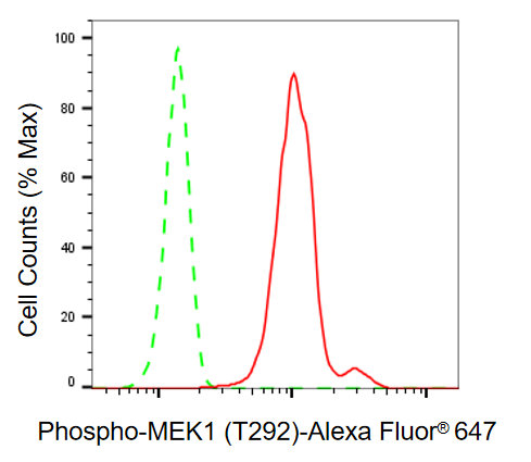 • Flow cytometric analysis of phospho-MEK1 (T292) expression in C2C12 cells using phospho-MEK1 (T292) antibody. Green, isotype control; red, phospho-MEK1 (T292).