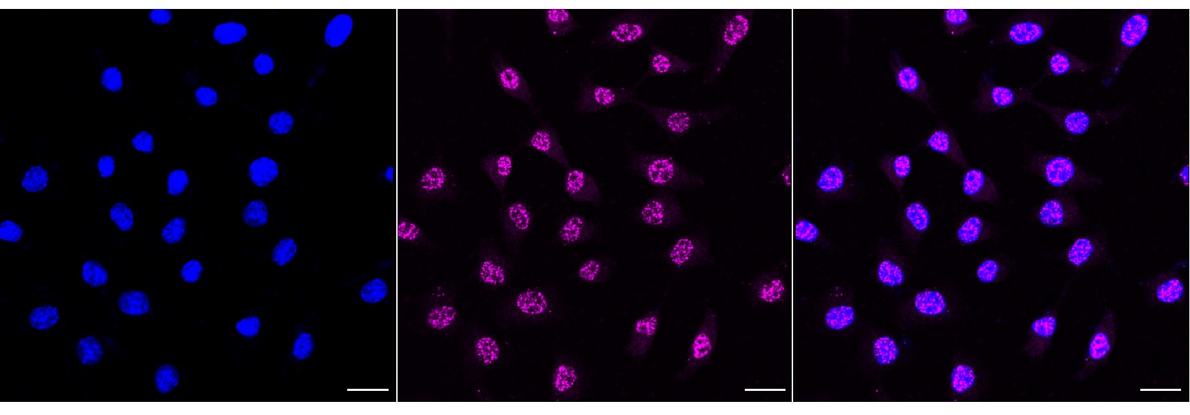 • Immunocytochemical staining of C2C12 cells with Phospho-MEK1 (T292) antibody. Nuclei were stained blue with DAPI; Phospho-MEK1 (T292) was stained magenta with Alexa Fluor® 647. Images were taken using Leica stellaris 5. Protein abundance based on laser Intensity and smart gain: Medium. Scale bar, 20 μm.